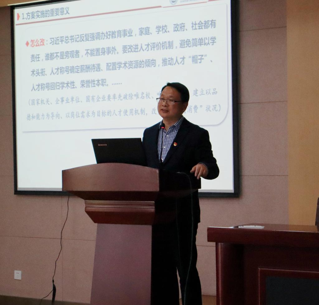 最后,潘庆伟还向全体教职工传达学习了中共中央、国务院印发的《深化新时代教育评教改革总体方案》的相关精神,希望全体教职工充分认识到教育评价改革的重要意义,增强深化新时代教育评价改革的责任感、使命感和紧迫感。