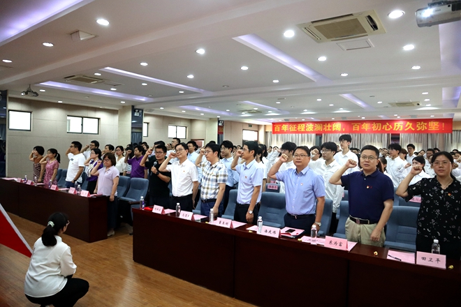 会上,田卫平带领全体党员师生共唱《国际歌》。随后,真材实料研究生党支部进行了开场诗朗诵《红船,从南湖启航》,带领全体党员重温中国共产党成立的伟大历史。潘庆伟郑重宣读学院优秀党员、优秀党务工作者、示范性基层党组织表彰文件并授予证书。东为富宣读新发展预备党员名单,并由全体党委委员、教工党支部书记为全体预备党员授予党徽。院学工办主任刘凡带领全体党员面向党旗郑重宣誓。