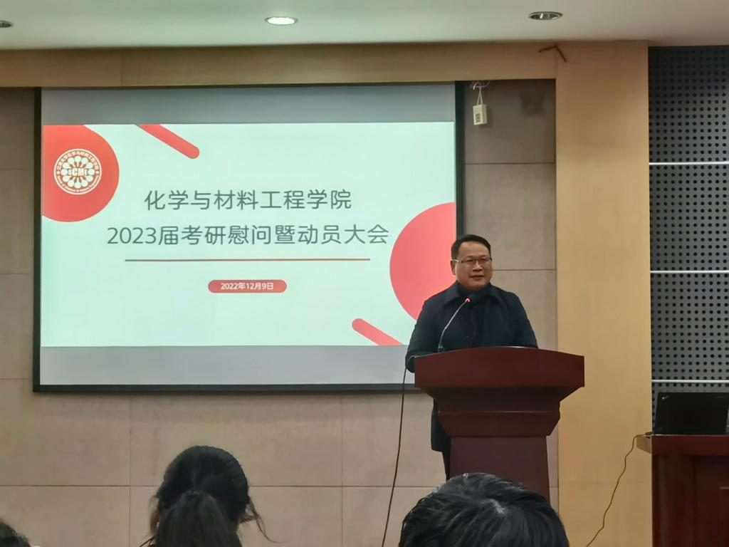 会上,潘庆伟作动员讲话。他首先肯定了考研学生的辛苦付出,并代表学院对全体考研学生表示慰问。他指出,化工学院考研氛围素来浓郁,2022届本科生升学率再创新高,他鼓励同学们,要有“长江后浪推前浪”的壮志情怀,也要有“梅花香自苦寒来”的坚强信念,更要有“咬定青山不放松”的恒心毅力,坚持不懈,奋力拼搏。