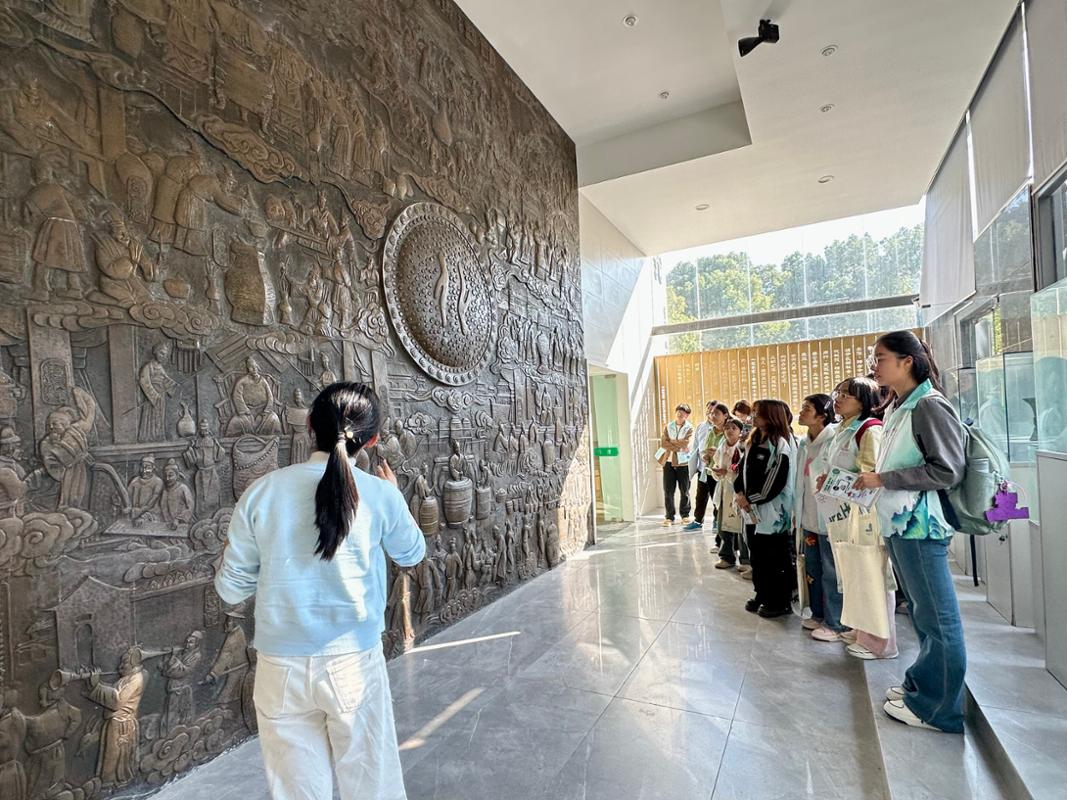 走进生物工程学院酒科技馆,这里以铜雕展示古代酿酒起源,以沙盘模型再现古代黄酒酿造场景。讲解者带领同学们探秘原料甄选的门道、曲的微生物世界、发酵的科学本质,解码酒香里的科学与文化,醇香醉人的酒文化。