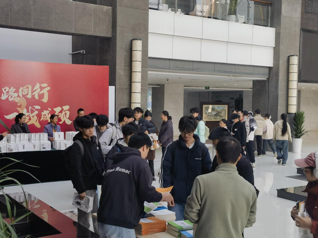 为切实满足考研学子需求,图书馆工作人员提前数周精心筹备,于一楼大厅布置了考研祝福展板,并将文具礼包与备考资料整齐摆放,供同学们领取。专属定制的考研助力大礼包上印有“嵩阳书院、白鹿洞书院、岳麓书院、应天书院”四大古代学府的文化图案,寓意学子们能够汲取深厚文化滋养,在考研路上厚积薄发。除大礼包外,现场还准备了丰富的考研、考公备考资料,每一份都承载着图书馆对学子们深深的祝福与鼓励。