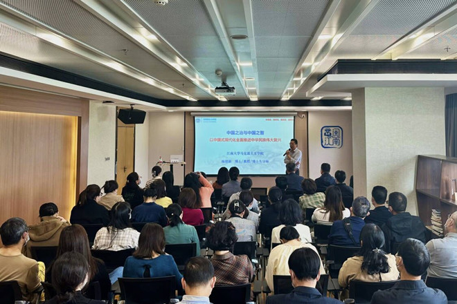 接着,陈绪新分别从“历史探索——中国现代化到中国式现代化”“中国之治——以中国式现代化全面推进中华民族伟大复兴”“中国之智——实现中华民族伟大复兴的精神力量”三个主题进行全面系统解读。梳理了“中国的现代化”到践行“中国式现代化”的历史转变进程,明确了中国式现代化的重要特征和本质要求。回顾了“中国之治”四十年来取得的骄人成绩,强调了中国特色社会主义道路是历史的结论、人民的选择。围绕“中国共产党为什么能”“马克思主义为什么行”两个问题,从人民、主义、理论、智慧、文化、文明历史、信仰等方面展示中国精神、中国之智的力量,凝练了中国式现代化不仅仅是为中国人民谋幸福、为中华民族谋复兴,而且还自觉地承担起为人类谋发展、为世界谋大同的历史使命。