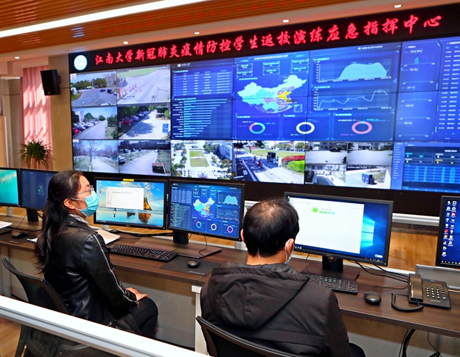运指中心与指挥部的工作人员正紧张有序地忙碌着。实时扫码进校人员、师生返校通填报情况汇总、隔离观察人数等返校通主要数据;车辆进出校门实时信息、师生校园卡刷门禁实时数据、各园区当日进出统计等学校态势系统主要数据在中心大屏上一目了然。出现突发状况后,运指中心收到指挥部发出的指令,立即调取相关监控画面,跟进救护、隔离、秩序维护、现场消杀等情况,并及时报告指挥部。
