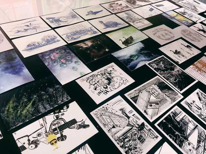 “画录美好,妆点生活。”是赵燕对中国连环画的会意。在课堂教学中,她采用传统技法与当今数字技术相结合的方式进行创作,引导学生学习和了解连环画的常用材料和制作技艺,并回顾了中国传统手工艺悠久而灿烂的历史。《俗世奇人》《公主奇幻记》等展出作品,不仅用笔画勾勒出状貌各异的人物角色,更是展现了传统绘画技艺与现代思想的趣味融合。展中亦可见学生所绘校园小景图铺于方桌,凝目所见,一笔一画尽显江南风情。