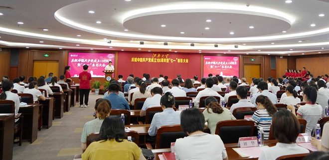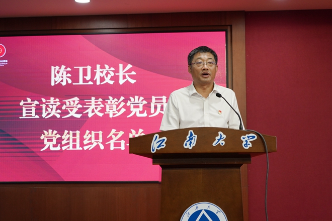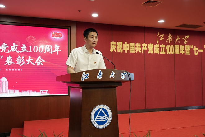 朱庆葆代表学校党委向受到表彰的优秀共产党员、优秀党务工作者和先进基层党组织表示热烈祝贺,向全校各领域各岗位上创先争优、奋斗奉献的8000余名共产党员致以节日的问候。他指出,我们党的一百年,是矢志践行初心使命的一百年,是筚路蓝缕奠基立业的一百年,是创造辉煌开辟未来的一百年。江南大学作为一所在党的领导与关怀下成立、成长起来的大学,秉承百余年优良办学传统,成为新中国首批创办的轻工业院校之一。建校63年来,学校始终与党和国家同向同行,与经济社会同频共振,为推动我国早日迈入“轻工强国”行列作出了积极贡献。