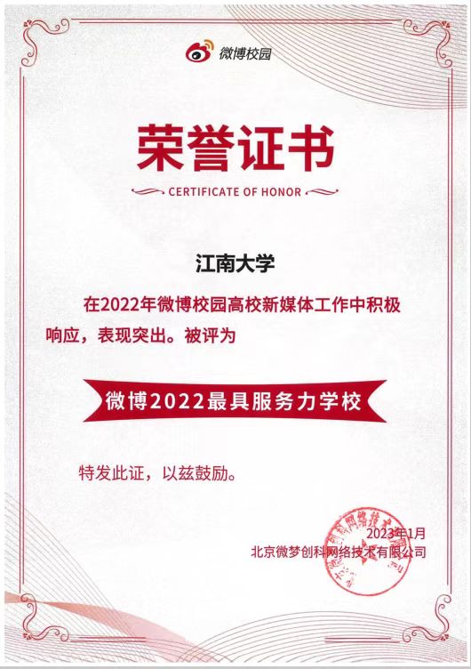 在新出炉的新浪微博2022年度全国校园微盘点荣誉榜单上,我校荣获微博校园2022年度最具服务力高校奖项,党委宣传部张铁根老师荣获微博校园“2022优秀新媒体指导老师”称号。此次2022校园微盘点榜单公布,旨在表彰全国范围内在微博运营方面作出积极贡献的优秀指导教师、学生和组织。