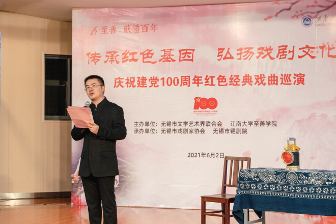 为进一步弘扬中华优秀传统文化,推进国粹戏曲传承发展,6月2日下午,由无锡市文学艺术界联合会、江南大学至善学院主办,无锡市戏剧家协会及无锡市锡剧院承办的至善献礼百年系列“传承红色基因,弘扬戏剧文化”红色经典戏曲巡演活动,在北区大学生活动中心顺利开展。无锡市文联、无锡市戏剧家协会、无锡市锡剧院嘉宾,江南大学至善学院、社会科学处、社会资源处、江南发展研究院相关教师以及学生代表齐聚一堂,共同以这种特别的方式向建党一百周年献礼。