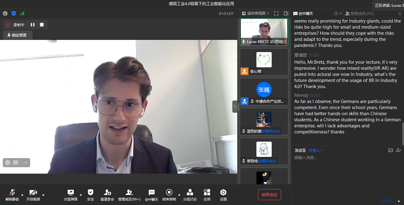 5月5日下午,至善讲坛“生涯导航”系列讲座《德国工业4.0背景下的工业智能化应用》在线上顺利举办。本次讲座邀请了全球先进制造研究所(Global Advanced Manufacturing Institute,简称GAMI)中国地区的总经理卢卡斯•布雷茨先生主讲,来自中德合作产业技术服务平台的张巍先生也作为参讲嘉宾出席本次讲座。卢卡斯•布雷茨先生博士学习及研究专注于利用人工智能和数字孪生技术对混合纤维增强的聚合物进行功能导向的质量保证。卢卡斯•布雷茨先生系统且详细地向同学们介绍了工业4.0背景下工业智能化如何能更好的为工业生产服务,为企业赋能。