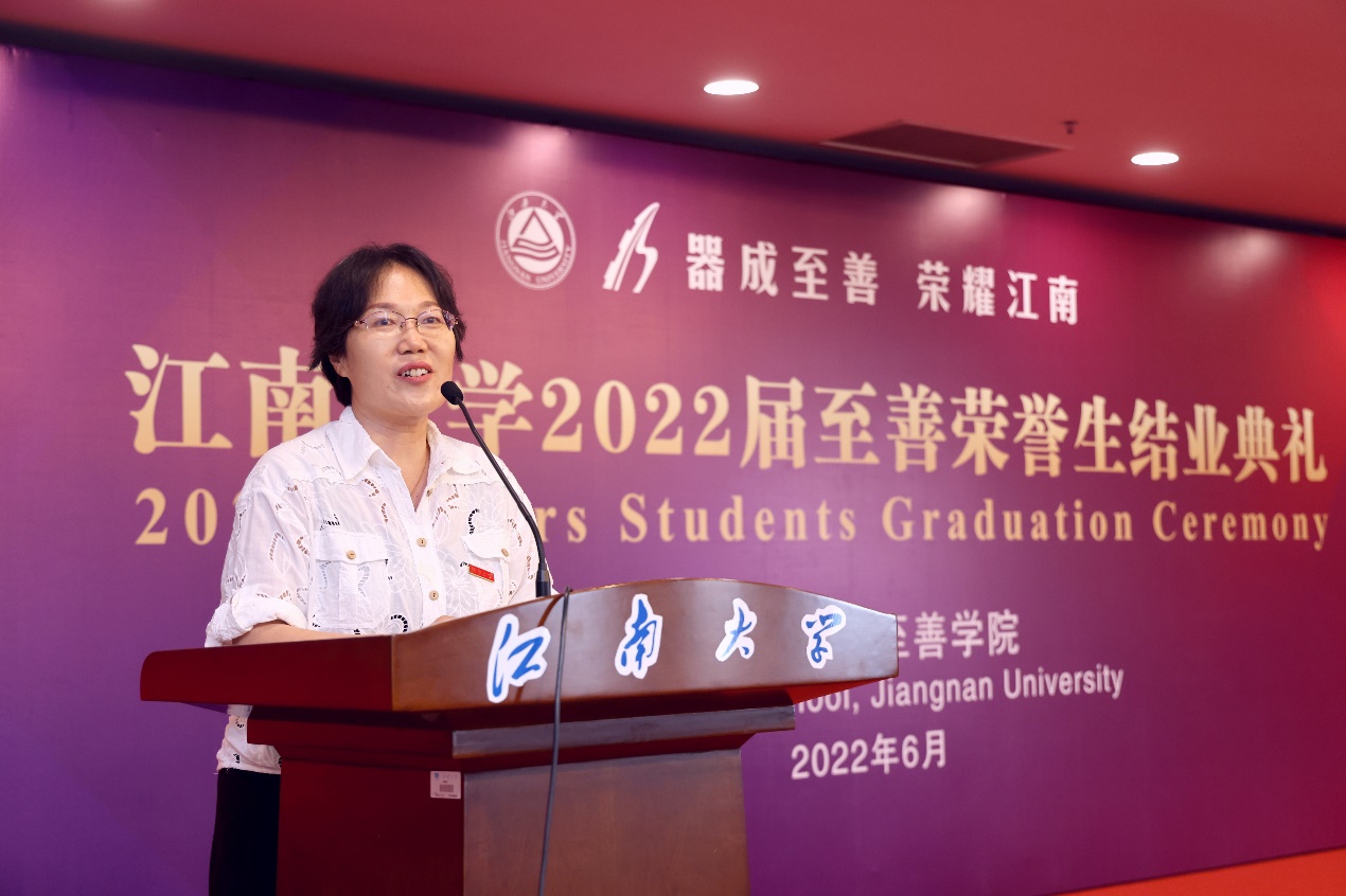 6月15日下午,江南大学2022届至善荣誉生结业典礼在图书馆五楼报告厅举行。江南大学校长陈卫,校党委常委、副校长、至善学院院长堵国成,无锡源清天木生物科技有限公司董事长兼总经理王立言、至善学院常务副院长刘立明、教务处处长兼至善学院副院长徐学明、学生工作处处长兼至善学院副院长张菁燕、至善学院副院长单筱婷等领导出席典礼,至善学院特聘指导教师、至善任课教师代表以及在校2022届至善结业生共同参与庆典。典礼通过腾讯会议同步进行直播。