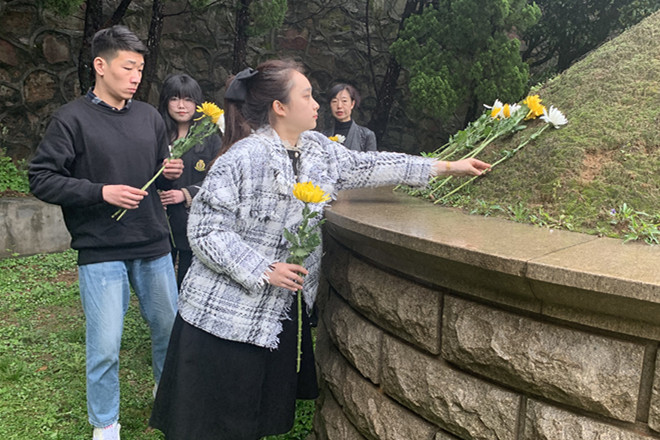 古木青松,苍翠肃穆,4月1日下午,教育发展基金会、社会资源处党支部全体党员、外国语学院师生代表一行40余人前往马山华侨公墓祭扫原国家副主席荣毅仁及其夫人杨鉴清墓地。