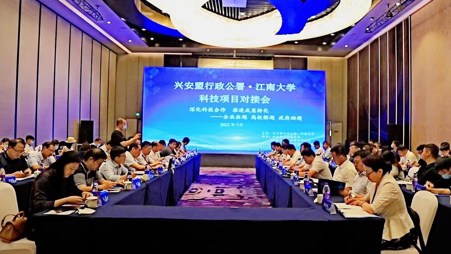 7月27日上午,兴安盟行政公署与江南大学科技项目对接会在无锡举行。兴安盟行署副盟长何伟利,盟行署副秘书长何云峰,盟科技局、盟区域经济合作局、兴安职业技术学院、盟农牧场管理局、盟工业和信息化局负责人,兴安盟和无锡市企业代表共50余人参会;江南大学党委常委、副校长顾正彪,校党委常委、党委办公室主任、党委统战部部长朱飞,产业技术研究院、食品学院、生物工程学院负责人及专家老师共20余人出席会议。本次会议分为科技项目对接会、科技招商引资推介会和项目签约会三个环节。会议由产业技术研究院院长刘龙主持。