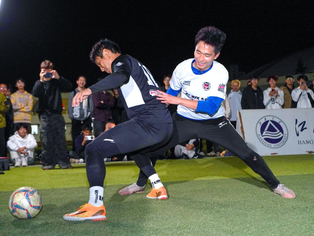 随后,张雨琦与卢则灵、李皓然、陈立群在体育中心,正式开启江南大学2025“足球达人进校园”活动。首先是同学与嘉宾展开1对1足球过人王表演赛,不乏技术出众者,凭借精湛球技战胜对手,濮宇尘老师、校女足队员也上场过招,现场喝彩如潮、气氛热烈,充分诠释足球的魅力;紧接着,张雨琦与“苏超”球员们同台切磋,让同学们近距离领略到“黄金左脚”的威力、无锡金靴李皓然的精准射术、卢则灵闪电般的冲刺速度,以及陈立群“叹息之墙”般的防守压迫感。在最后的射门测速环节中,同学们踊跃参与测试,三位职业球员也现场展示了令人惊叹的专业实力。