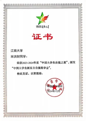 近日,由共青团中央、全国学联联合指导,团中央基层建设部和中国青年报社共同主办的2023—2024年度“中国大学生自强之星”奖学金评选活动结果揭晓。我校设计学院博士研究生宋洪财、物联网工程学院硕士研究生霍雷霆荣获“中国大学生自强之星”称号。