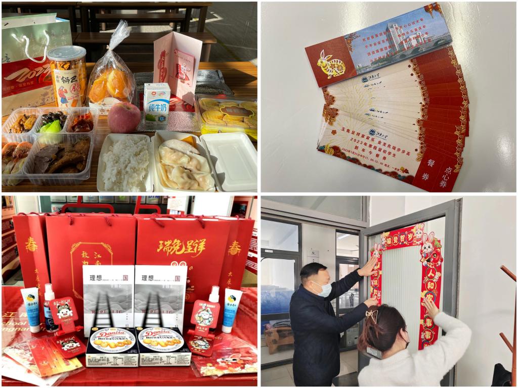 有情有爱暖心节,心安之处便是家。一句句殷切叮嘱饱含着浓浓情谊、一件件精心准备的礼包传递着深深的关切。多年我校始终高度重视寒假留校学生们的学习和生活情况,秉持“以人为本”的理念,通过走访慰问、除夕午宴、发放礼包慰问金等形式为留校学生们送去温暖、带去祝福,陪伴着大家度过了一个又一个节日,迎接了一年又一年的新春。新一年的金色阳光即将洒满江南大地,愿我们行且益坚,共同奔赴春的画幅诗景,与明媚春光热烈相拥。也祝福所有江南大学的老师同学们满怀上一年的热爱,奔赴下一年的山海,万事都胜意,未来皆可期!
