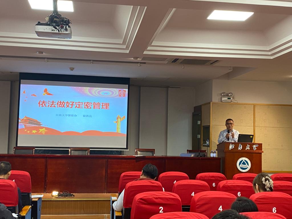 保密工作办公室专职保密员徐洪亮老师作了定密工作讲解。他从定密管理法规制度体系切入,就定密权、定密责任人、密点标注、原始定密、派生定密等基本概念做了详细阐述,并结合学校定密工作现状,重点讲解了定密审核、解密等实际工作中的难点问题。