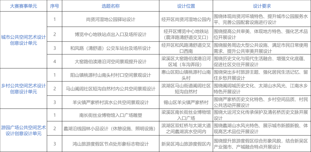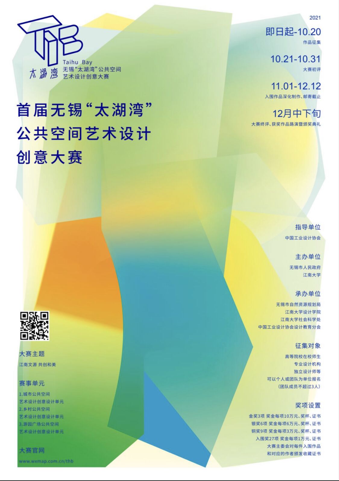 由无锡市、江南大学举办的“太湖湾”公共空间艺术设计创意大赛旨在响应“人民对美好生活的向往,就是我们的奋斗目标”,并结合文化强国,城市高质量发展,以科创、绿色、生态、低碳、共享为主旨,塑造环太湖科创带国际科技产业集聚区公共空间的整体无锡城市新时代文化与艺术形象。首届大赛将以“江南文源、共创和美”为主题,涵盖城市形象品质提升、乡村文化振兴、生态文旅等多个层面。
