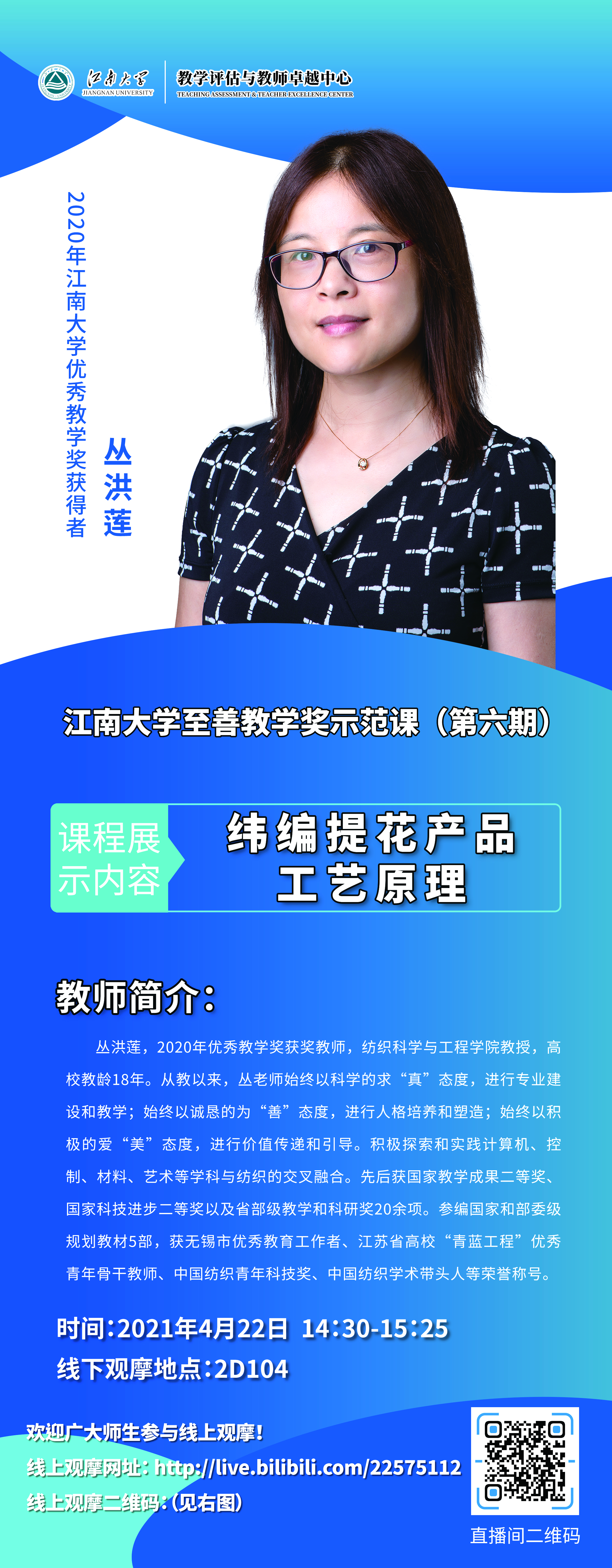 丛洪莲,2020年优秀教学奖获奖教师,纺织科学与工程学院教授,高校教龄18年。从教以来,丛老师始终以科学的求“真”态度,进行专业建设和教学;始终以诚恳的为“善”态度,进行人格培养和塑造;始终以积极的爱“美”态度,进行价值传递和引导。积极探索和实践计算机、控制、材料、艺术等学科与纺织的交叉融合。先后获国家教学成果二等奖、国家科技进步二等奖以及省部级教学和科研奖20余项。参编国家和部委级规划教材5部,获无锡市优秀教育工作者、江苏省高校“青蓝工程”优秀青年骨干教师、中国纺织青年科技奖、中国纺织学术带头人等荣誉称号。