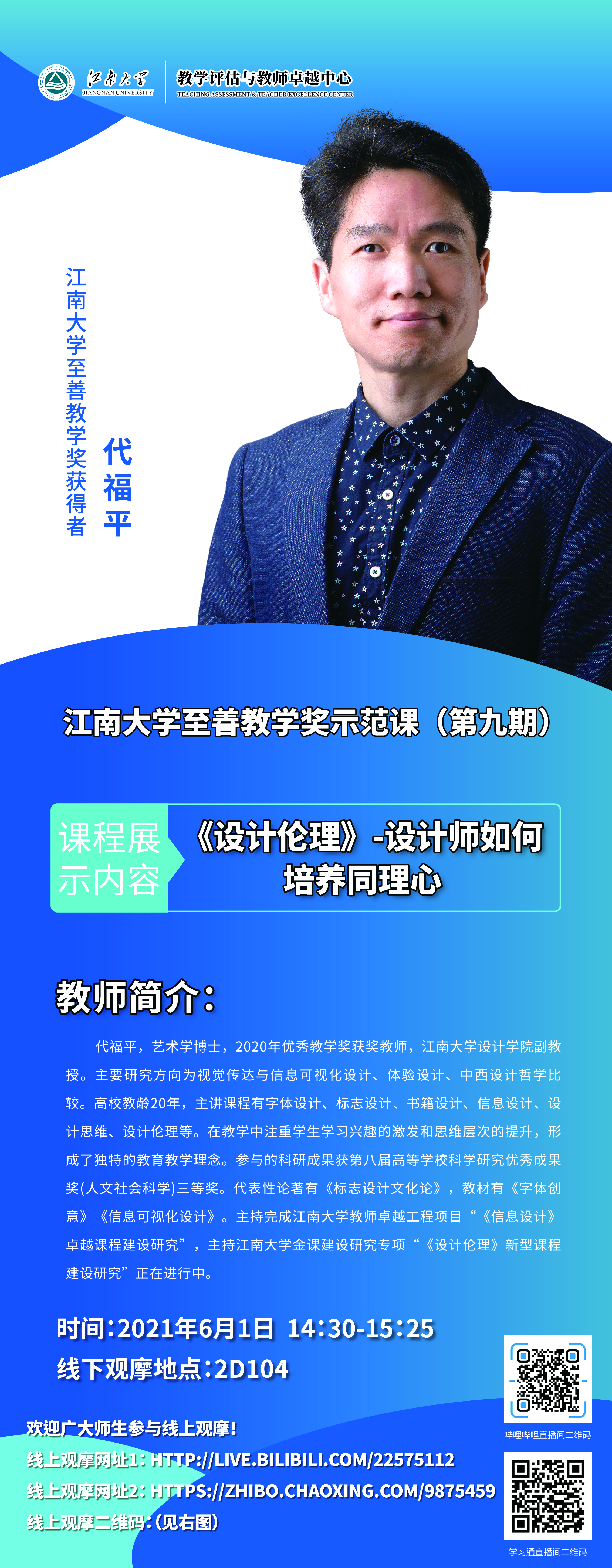 代福平,艺术学博士,2020年优秀教学奖获奖教师,江南大学设计学院副教授。主要研究方向为视觉传达与信息可视化设计、体验设计、中西设计哲学比较。高校教龄20年,主讲课程有字体设计、标志设计、书籍设计、信息设计、设计思维、设计伦理等。在教学中注重学生学习兴趣的激发和思维层次的提升,形成了独特的教育教学理念。参与的科研成果获第八届高等学校科学研究优秀成果奖(人文社会科学)三等奖。代表性论著有《标志设计文化论》,教材有《字体创意》《信息可视化设计》。主持完成江南大学教师卓越工程项目“《信息设计》卓越课程建设研究”,主持江南大学金课建设研究专项“《设计伦理》新型课程建设研究”正在进行中。