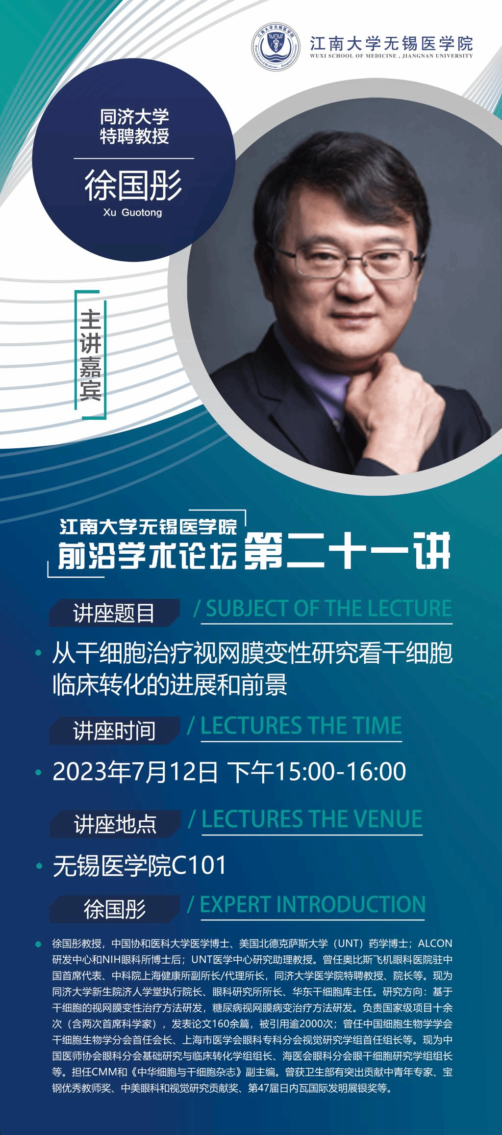 7月12日江南大学无锡医学院前沿学术论坛第二十一讲 徐国彤教授——从干细胞治疗视网膜变性研究看干细胞临床转化的进展和前景