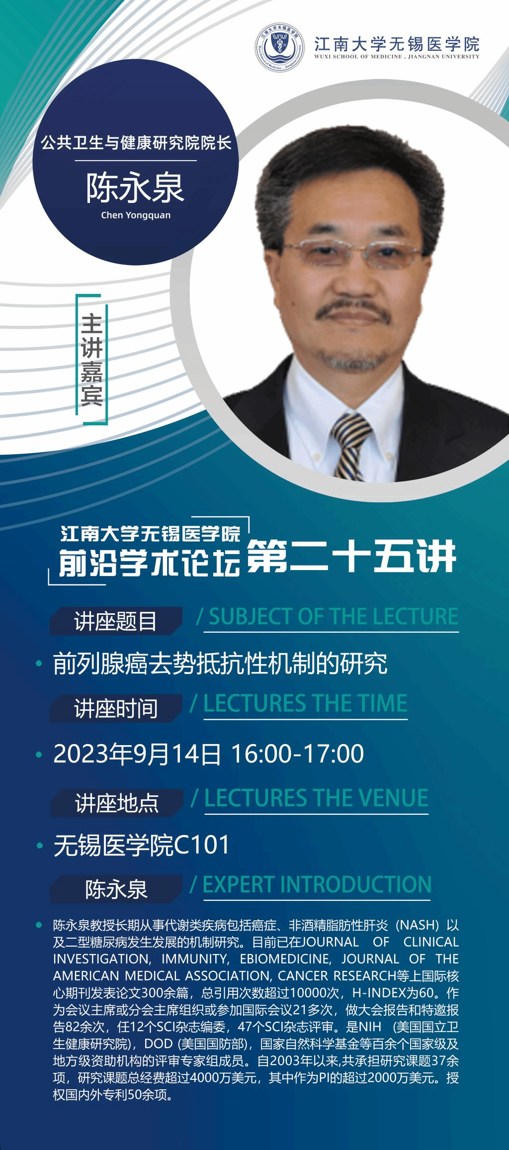 9月14日江南大学无锡医学院前沿学术论坛第二十五讲 陈永泉教授——前列腺癌去势抵抗性机制的研究