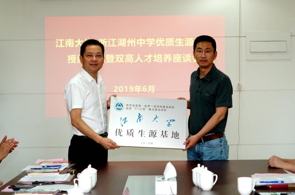 考察团在行政楼304会议室召开了“江南大学-湖州中学优质生源基地”授牌仪式暨双高人才培养座谈会。会上,校党委副书记戴月波代表学校向湖州中学授予“优质生源基地”牌匾,感谢湖州中学长期对我校优质生源的输送。他在发言中阐述了新一轮科技与产业革命背景下,国际竞争归根到底是人才的竞争,培养人才的能力才是国家真正的竞争力;构建德智体美劳全面培养的教育体系,形成更高水平的人才培养体系需要高中和高校有效衔接,高校一方面要聚焦专业内涵发展,根据高考综合改革的要求深入推进本科教学改革;另一方面要主动向高中延伸,进行大学文化引领、专业引领和生涯引领,构建交互式“育人共同体”。周国平在发言中说,江南大学地处无锡,与湖州同饮一湖水,隔湖两相望,是离湖州最近的省外211高校,地缘优势成为江南大学吸引湖中学子的优势之一;湖州中学作为浙江省首批重点中学,百年办校历程培养了各领域大批社会英才,希望能为江南大学继续输送一流学科的后备军;希望能借力江南大学加强新高考背景下普通高中学生综合素质培养机制与课程体系的研究与建设,搭建培养高中学生和教师创新思维和创新能力的平台,促进优质教育资源的共享。