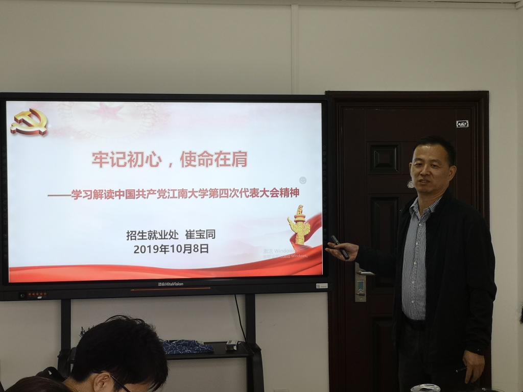 10月8日下午,为深入贯彻落实开展“不忘初心、牢记使命”主题教育的总体部署,全面落实我校第四次党代会精神,招生就业处处长崔宝同教授在A504会议室作了题为“牢记初心,使命在肩——学习解读中国共产党江南大学第四次代表大会精神”的专题党课。