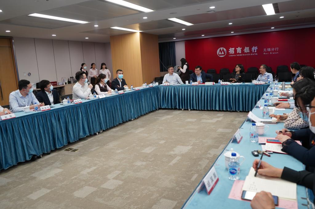 张影陆一行在徐鑫的带领下依次参观了招行的对公、对私柜台、金葵花理财中心、出国金融中心等服务功能区,切身体验了招行“因您而变”的服务理念和人性化的工作环境,了解了分行主要的业务流程以及金融科技的发展趋势。随后,双方召开江南大学-招商银行无锡分行访企拓岗促就业座谈会。