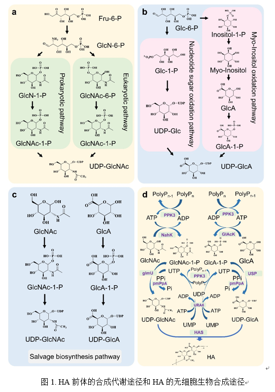透明质酸(HA)是由葡萄糖醛酸(GlcA)和N-乙酰氨基葡萄糖(GlcNAc)的重复二糖单元组成的线性多糖。HA作为全球最具价值的生物高分子之一,被广泛应用于皮肤填充剂、创伤愈合、药物递送以及组织工程等领域,这凸显了对高纯度、高性能生物材料的迫切需求。无细胞催化因其可以消除细胞膜屏障和相关的传质限制,通过在体外重建简化的酶促合成途径,避免复杂的代谢网络和固有的物理障碍,高效合成产物的同时避免复杂的下游纯化工艺,因此极具应用潜力。近期,江南大学生命科学与健康工程学院史劲松教授团队联合中南大学姜守勇教授、荷兰代尔夫特理工大学Frank Hollmann教授在《ACS Sustainable Chemistry & Engineering》期刊(一区TOP期刊,IF 7.3)上发表论文,通过无细胞催化系统构建透明质酸合成体系,该体系在无需活细胞的情况下合成HA,消除了生物学瓶颈的同时,使生产更快速、更清洁且更高效,同时有望应用于靶向标记HA的合成,并为其他高价值的糖胺聚糖工程化生产平台建立提供了可借鉴的思路。