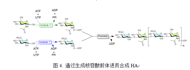 论文建立了一种无细胞级联催化系统,利用核苷酸补救途径,从廉价的单糖高效合成UDP-GlcA和UDP-GlcNAc,从而绕过了耗能的从头合成路线;并通过截短多杀巴斯德菌透明质酸合酶(PmHAS)的膜结合相关结构域,实现了其水溶性表达水平及顺序糖基转移酶活性。此外,还实施了ATP/UTP双再生策略以维持核苷酸供应。在优化条件下,该系统在24小时内可合成1.28 g/L的HA,其分子量范围为1.28×10⁴-1.02×10⁶ Da,底物转化率达到65.9%。这项工作不仅为规模化HA合成提供了一个经济平台,也为复杂生物聚合物建立了一个模块化的酶促工程化生产示范,在合成糖生物学领域展示了广泛的应用潜力。